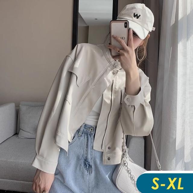 CHACO/預購/女春秋 米白色美式寬鬆落肩短版質感皮衣外套#PY2401(米白 夾克 皮衣 PU 女 春秋 外套 機車服)