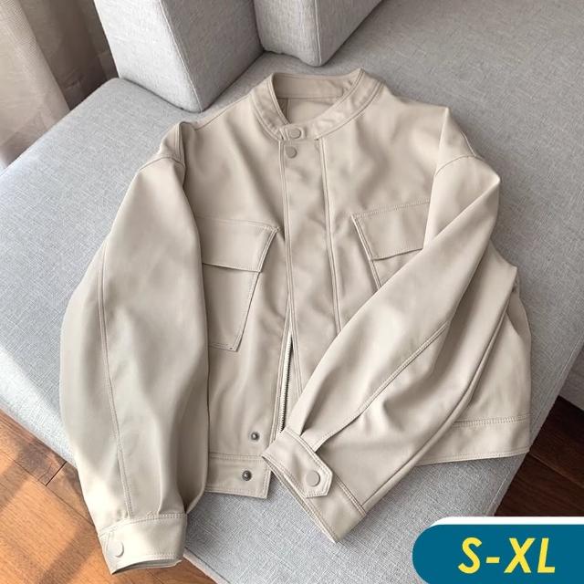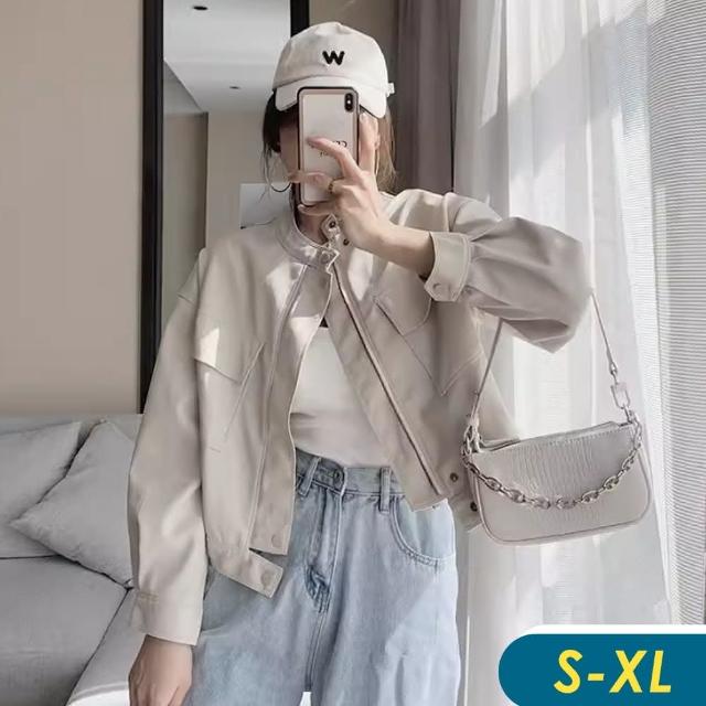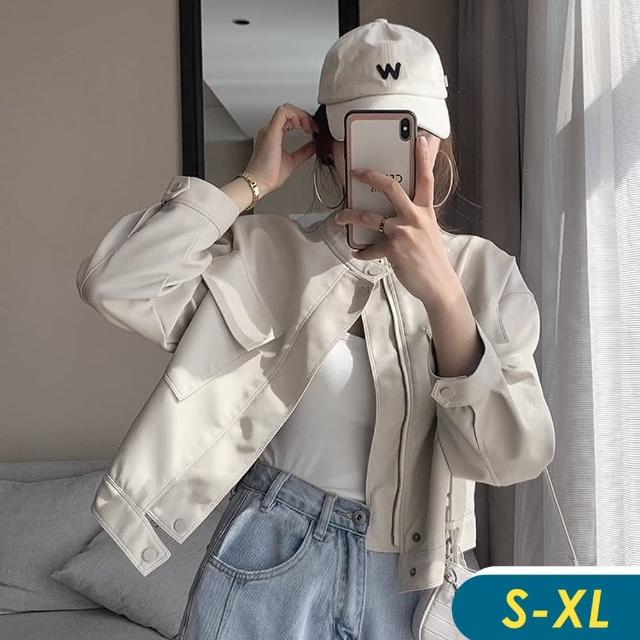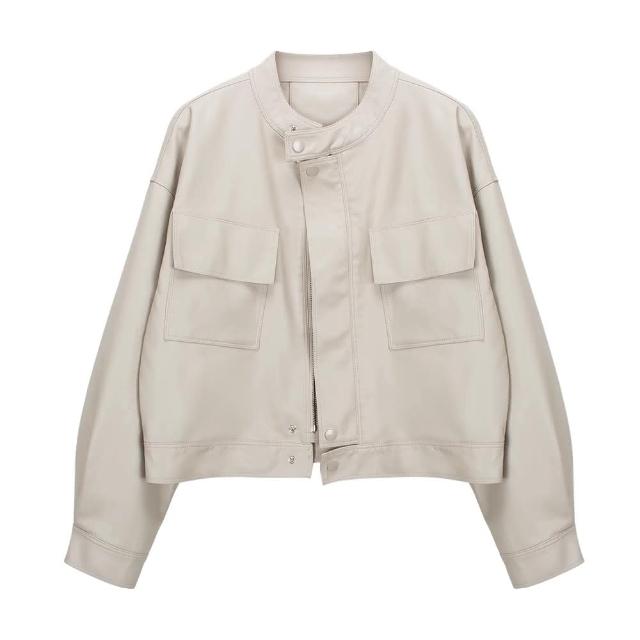 CHACO/預購/女春秋 米白色美式寬鬆落肩短版質感皮衣外套#PY2401(米白 夾克 皮衣 PU 女 春秋 外套 機車服)