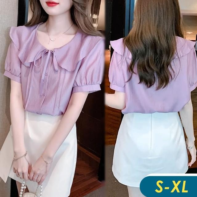 CHACO/現貨/女夏芋紫色繫帶娃娃領短袖排釦 薄涼感 雪紡襯衫上衣#8373(涼感 芋紫 雪紡 上衣 娃娃領 襯衫 女 夏)
