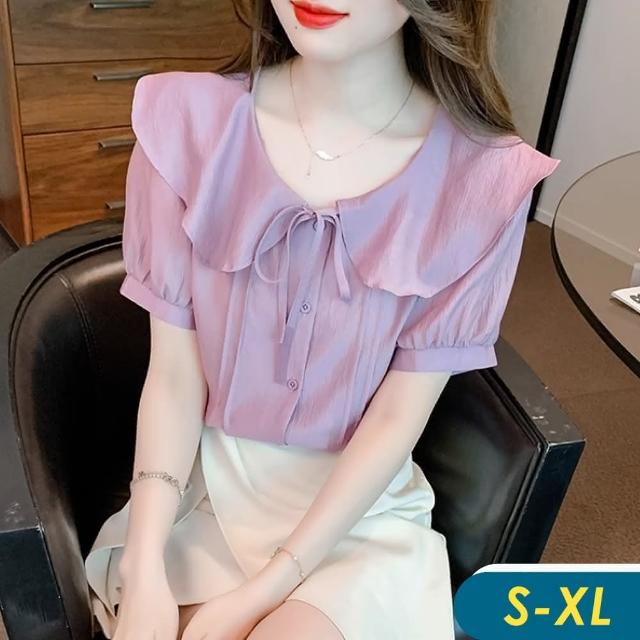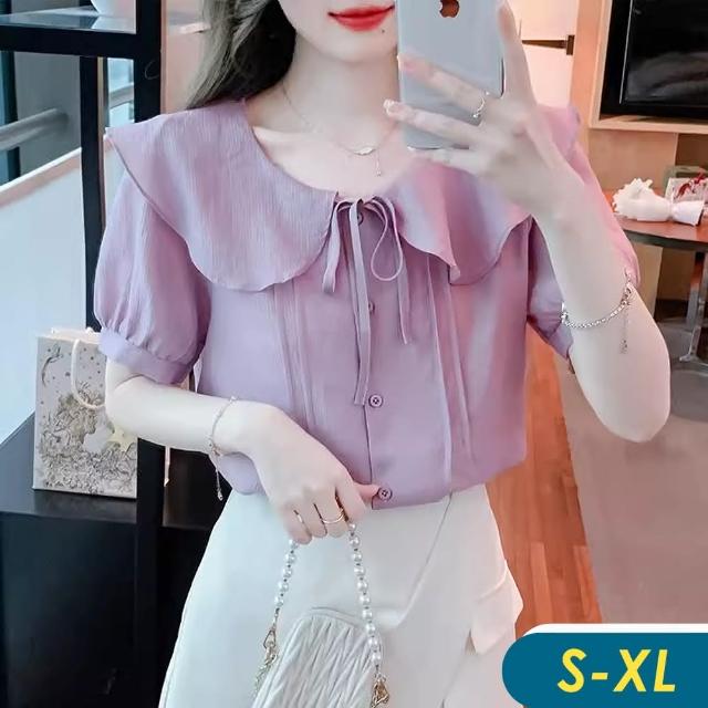 CHACO/現貨/女夏芋紫色繫帶娃娃領短袖排釦 薄涼感 雪紡襯衫上衣#8373(涼感 芋紫 雪紡 上衣 娃娃領 襯衫 女 夏)