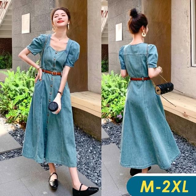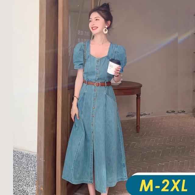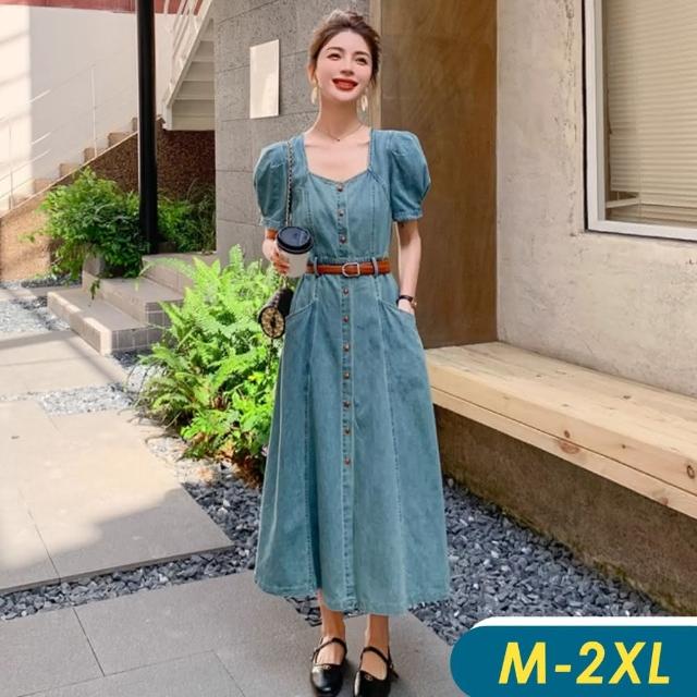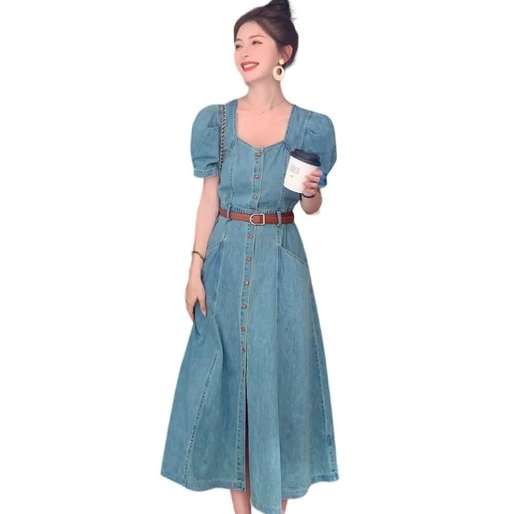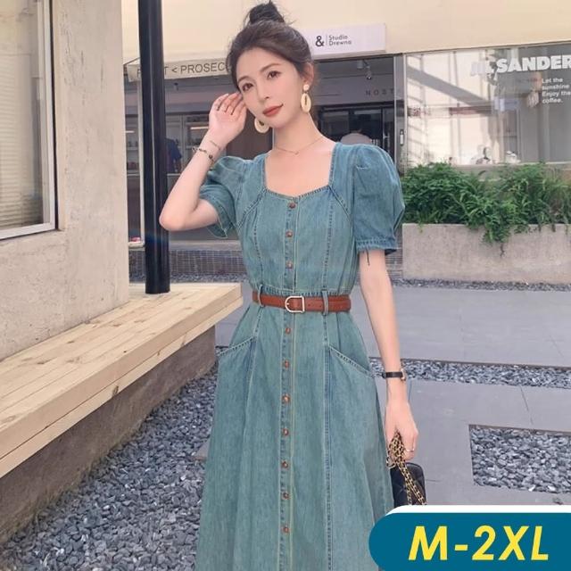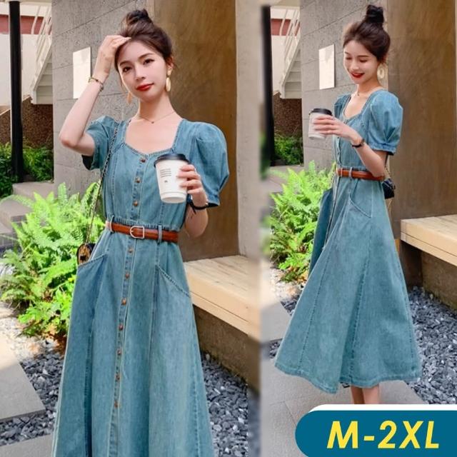 CHACO/預購/女法式復古方領泡泡短袖排釦收腰牛仔大擺連身裙洋裝+皮帶#822 (牛仔 長版 連身裙 排釦 洋裝 春夏 女)