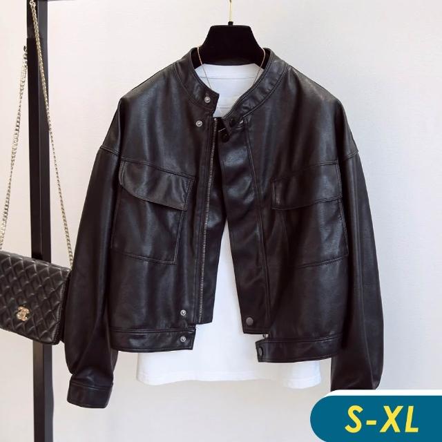 CHACO/預購/女春秋 黑色短版圓領皮衣美式寬鬆落肩軟感夾克外套#PY9313BK (夾克 皮衣 PU 女 春秋 外套 機車服)