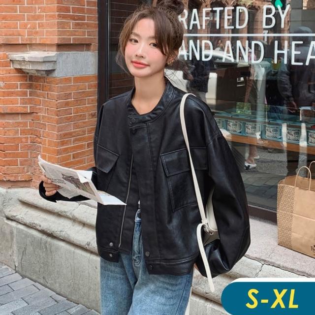 CHACO/預購/女春秋 黑色短版圓領皮衣美式寬鬆落肩軟感夾克外套#PY9313BK (夾克 皮衣 PU 女 春秋 外套 機車服)