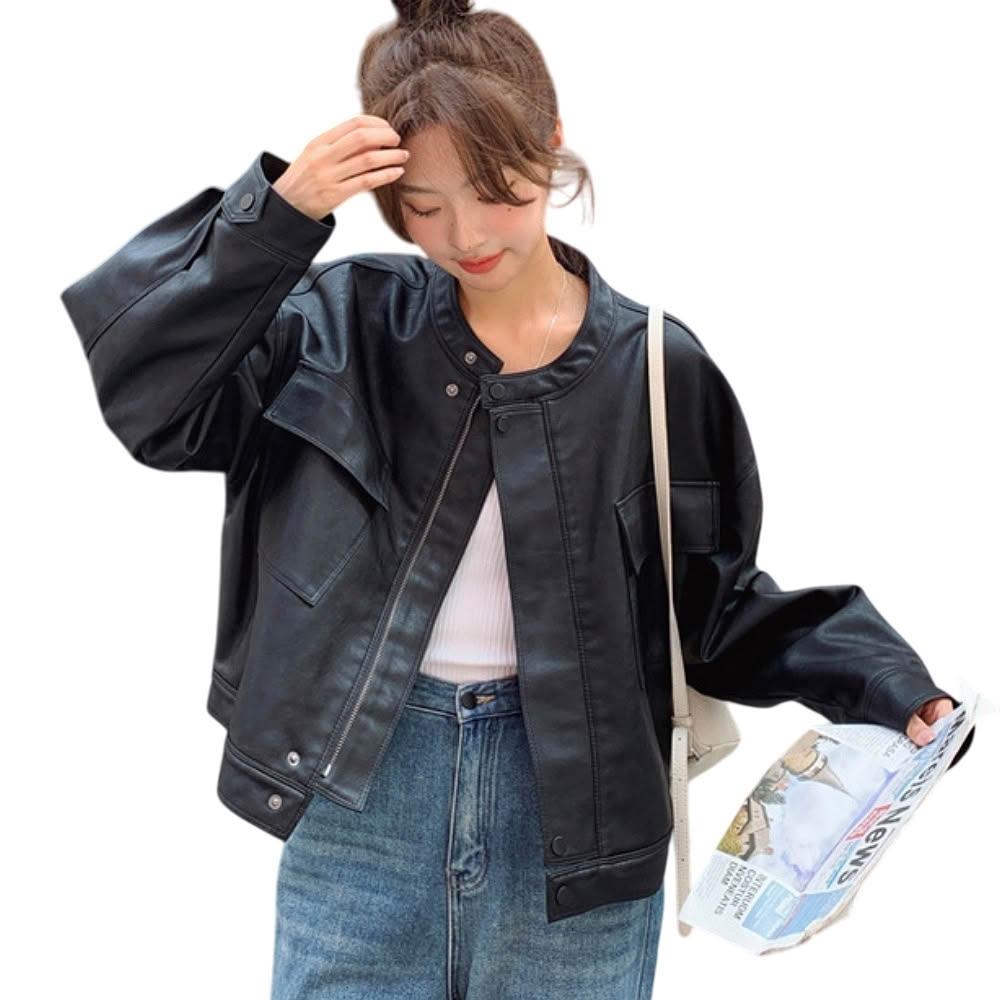 CHACO/預購/女春秋 黑色短版圓領皮衣美式寬鬆落肩軟感夾克外套#PY9313BK (夾克 皮衣 PU 女 春秋 外套 機車服)