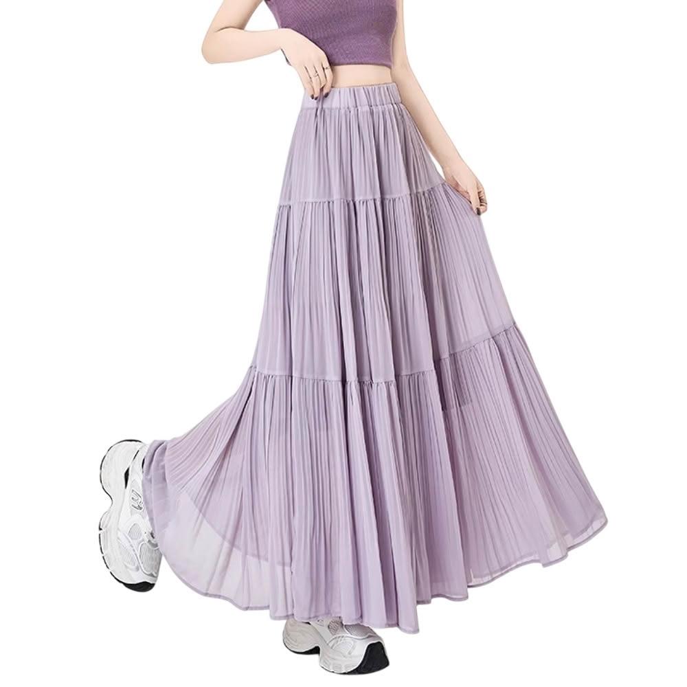 CHACO/現貨/ 女夏 超仙百褶雪紡半身裙 A字大裙襬垂感超長裙#9188 (紫色 雪紡 半身裙 長裙 女性)