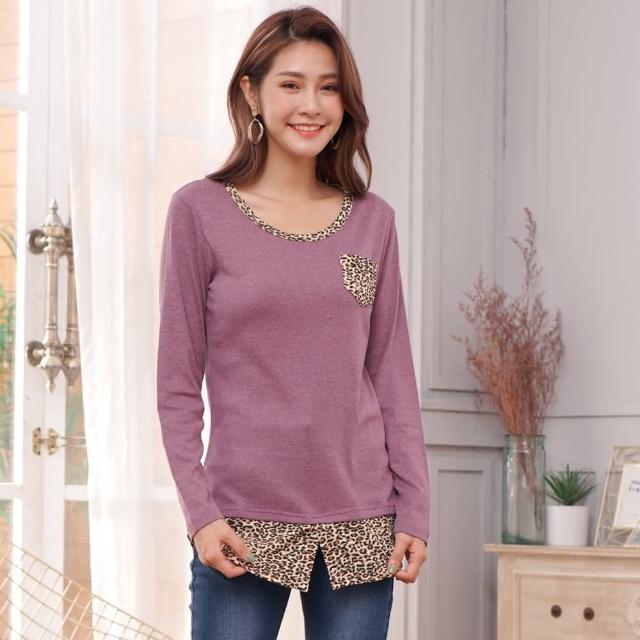 衣心衣意現貨MIT-韓版豹紋假二件口袋長版上衣(紫色YG3A1093)