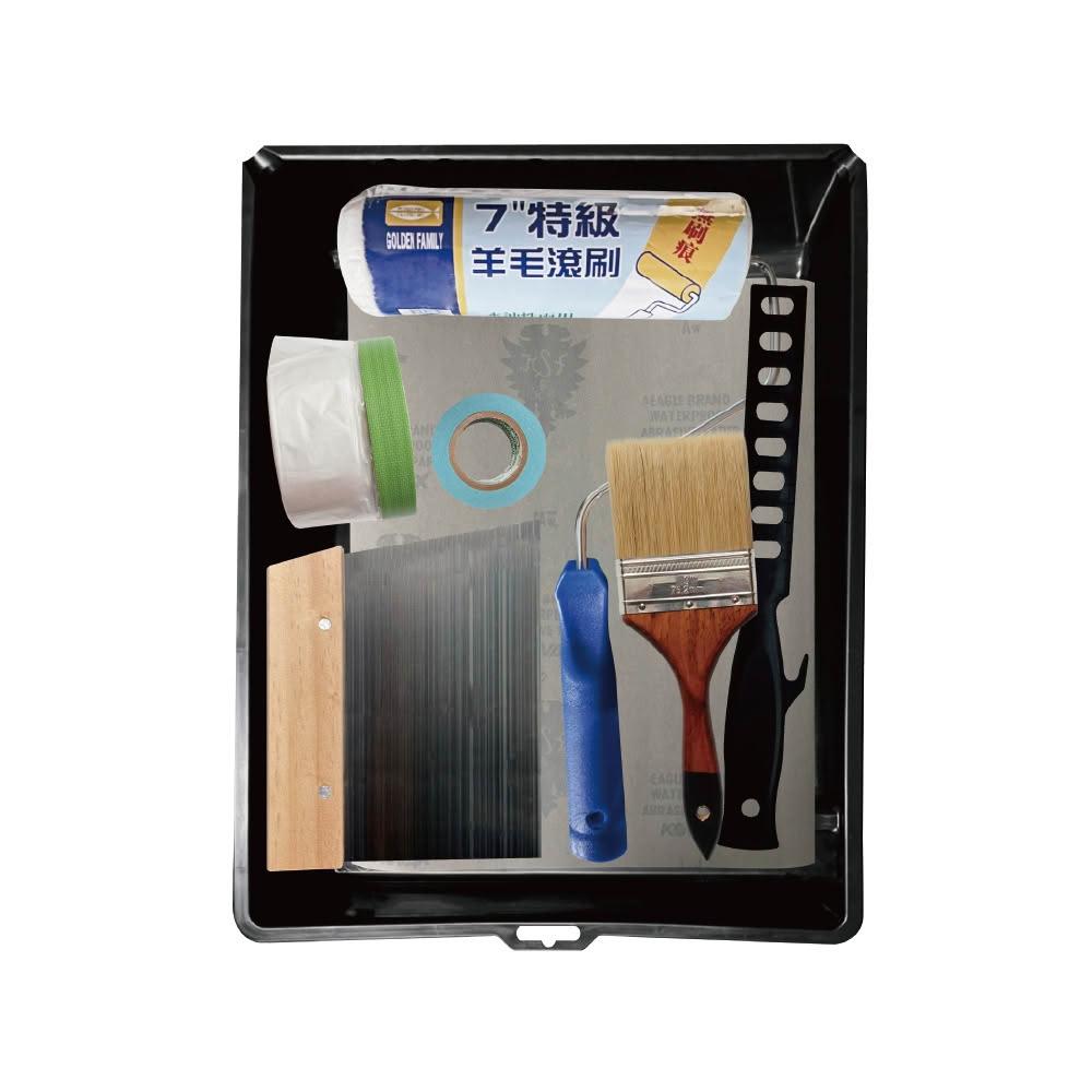 ★油漆工具★室內粉刷工具組(B)丨9吋油漆盤、羊毛滾刷、冠明毛刷、補刀、遮蔽膠帶、砂紙、攪拌棒丨刷具丨室內粉刷丨油漆DIY