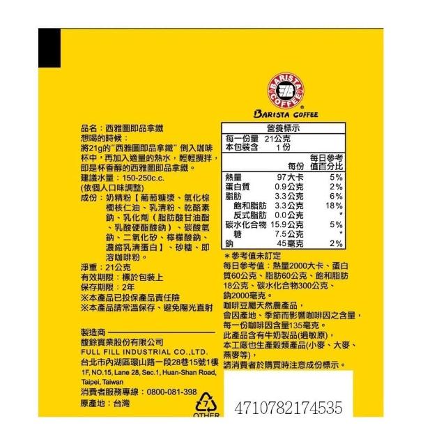 西雅圖BARISTA COFFEE 西雅圖即品拿鐵3合1咖啡21gx100包(袋裝出貨/有糖)