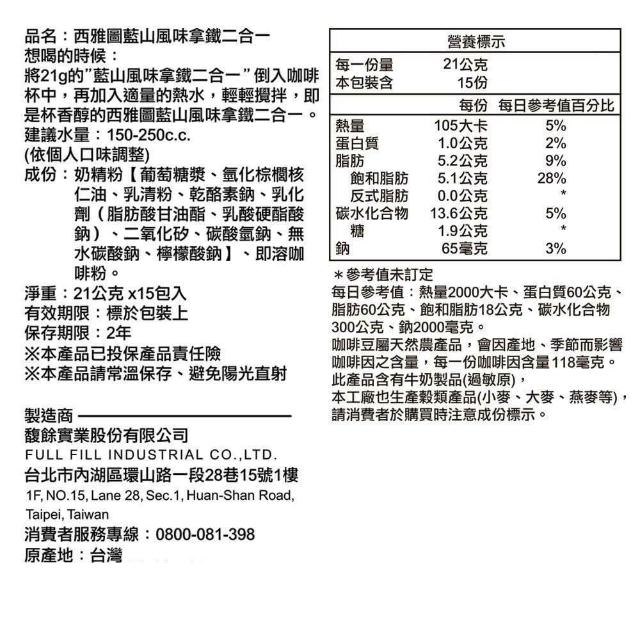 西雅圖藍山風味拿鐵二合一咖啡-21gx100入袋裝(即溶/拿鐵/咖啡/無糖)