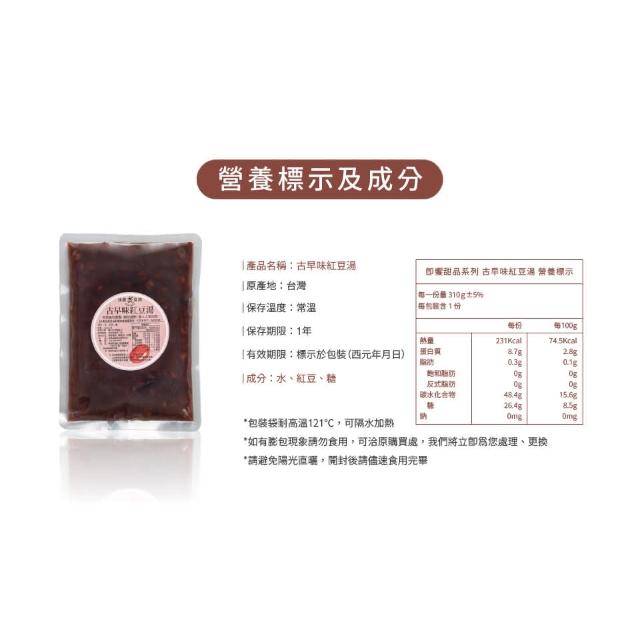 快饗食刻古早味紅豆湯 4入組(310g/包)(常溫保存 紅豆湯 銀耳羹 綠豆湯 紫米粥 甜湯 飲料 調理包 即飲包 露營 養生 坐月子)