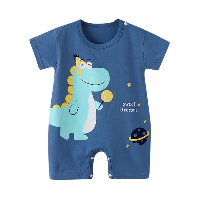 JoyBaby春夏童裝 短袖包屁衣 卡通肩扣薄款連身衣 深藍恐龍