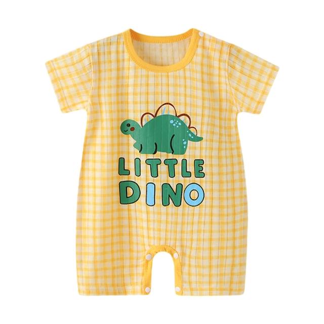 JoyBaby春夏童裝 短袖包屁衣 卡通肩扣薄款連身衣 黃格恐龍