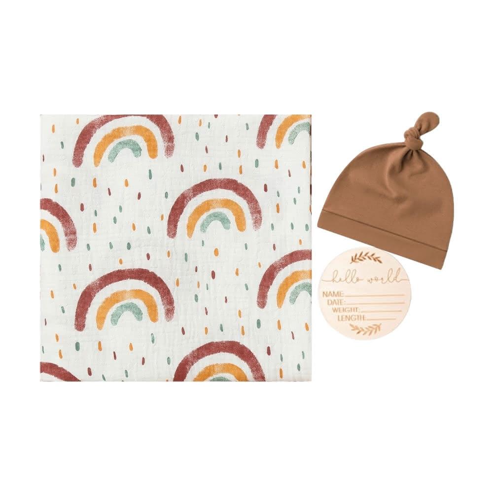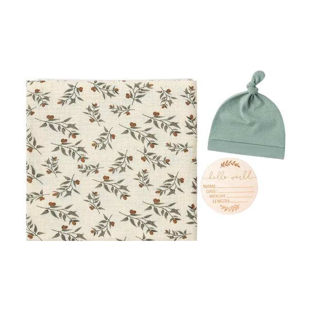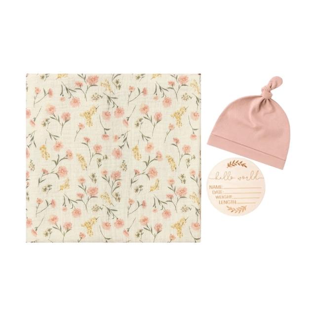 JoyBaby紗布包巾 新生嬰兒包巾+胎帽+木質名牌3件套 100x100cm 抱被 防驚嚇包巾 蓋毯
