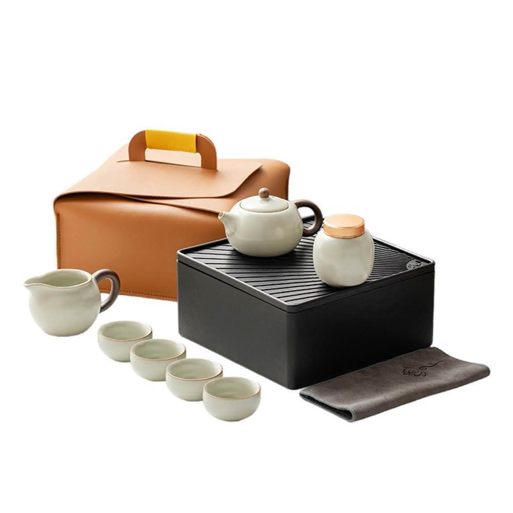 米黃汝窯旅行茶具套組/附皮革收納包(交換禮物 茶具 旅行茶具 泡茶 簡易泡茶 茶器套組)