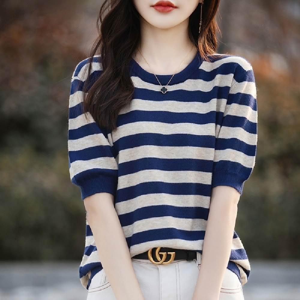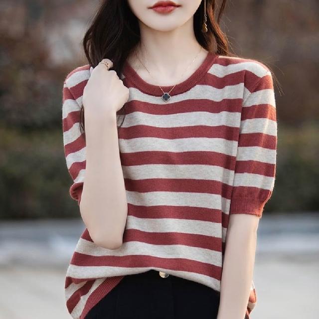 Mila米拉 ★寬條紋針織五分袖上衣上衣/女裝/T恤/休閒/百搭