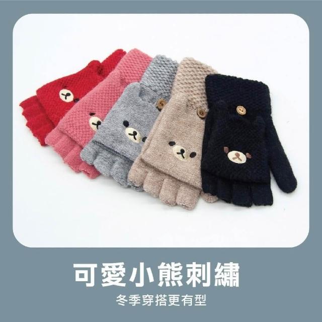 瑟夫貝爾體溫魔術師丨MIT台灣製 女士小熊刺繡半指翻蓋釣魚手套 保暖透氣針織毛線手套
