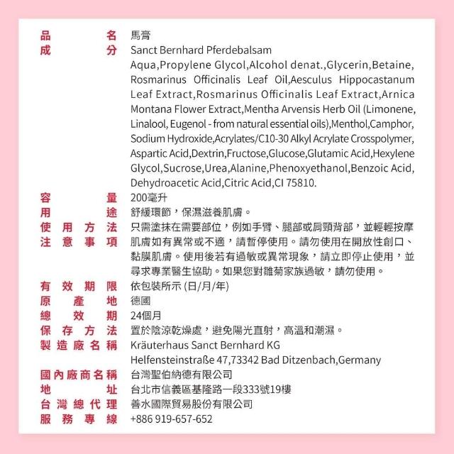 Sanct Bernhard 聖伯納德德國百年草本 按摩馬膏 (200ml/瓶 揮別疲勞不適感)