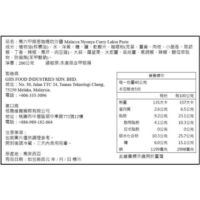 馬來西亞 愛加料 HENG'S 馬六甲娘惹 咖哩叻沙醬 Malacca Nyonya 200公克/袋 地道娘惹風味