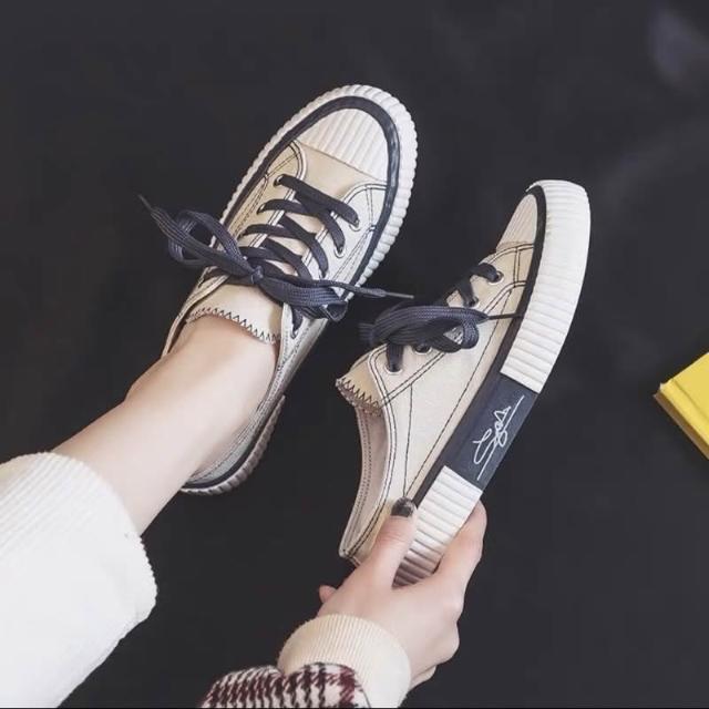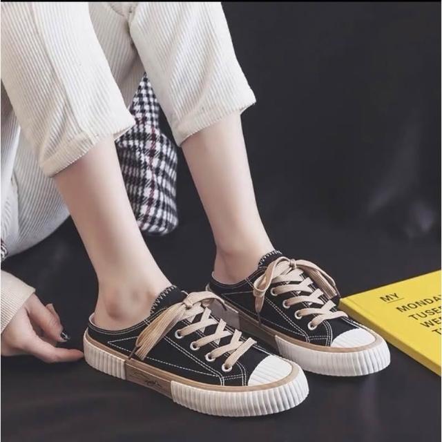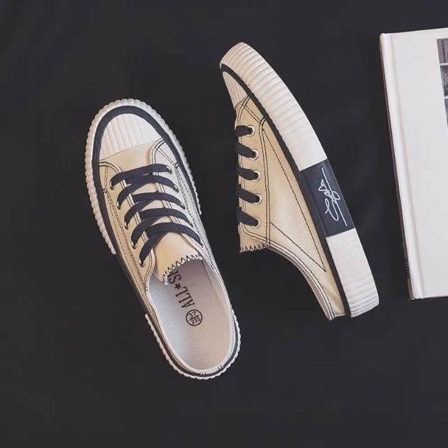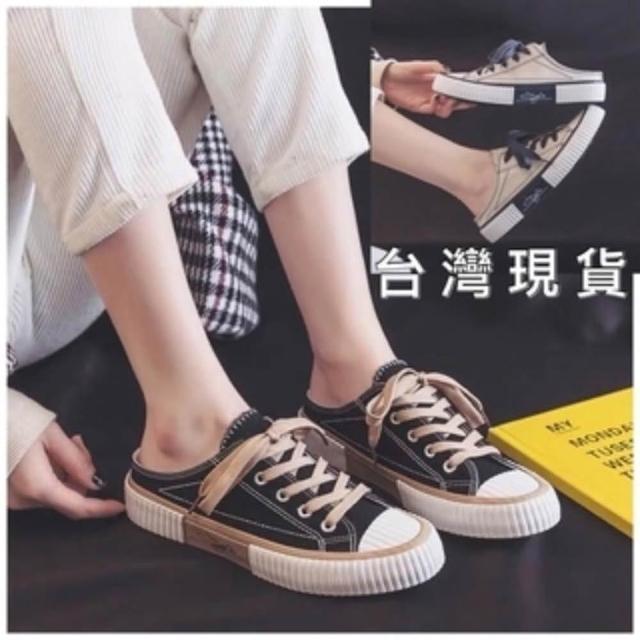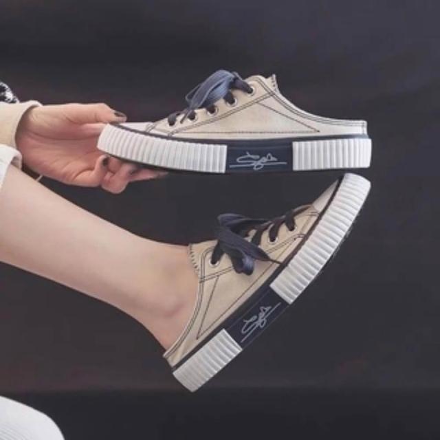 韓風時尚美鞋館 帆布懶人鞋 帆布鞋 懶人鞋 小白鞋 穆勒鞋 奶茶焦糖白半拖餅乾綁帶休閒 穆勒餅乾鞋 純色小白鞋 休閒鞋