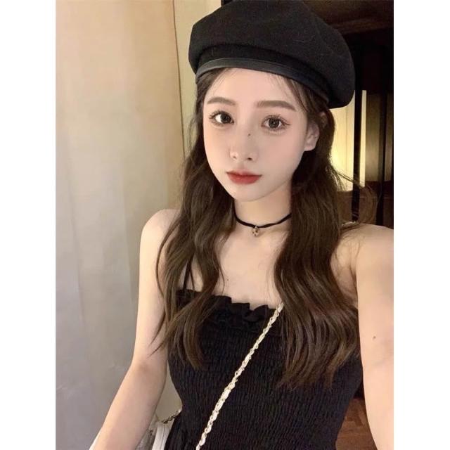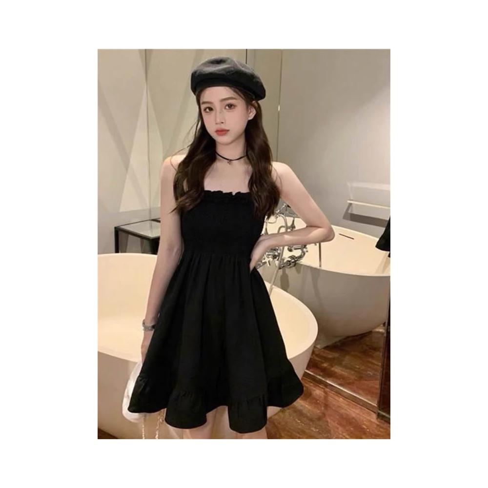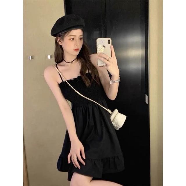 韓風時尚美鞋館 高級感 女裝 黑色 吊帶洋裝 女夏季氣質別緻絕美收腰顯瘦小個子 a字短裙 連衣裙 小禮服洋裝 性感衣服