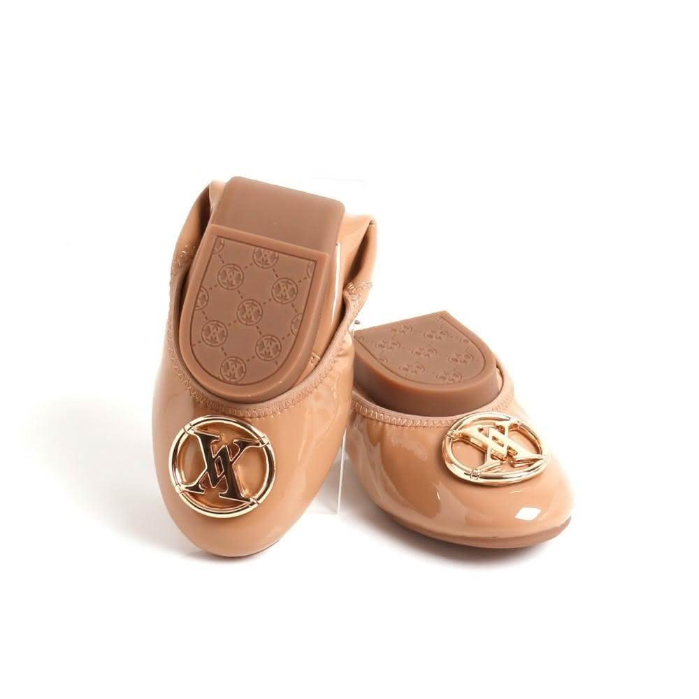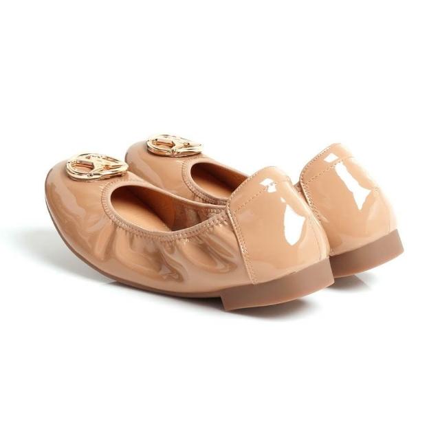 viina嬿娜1·經典漆皮金扣LOGO折疊平底娃娃鞋-杏(版型偏小1碼)