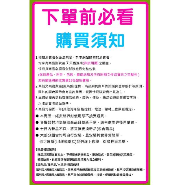 - 針對大型商品(包括:大型家電、家具床墊、健身按摩器材、車類...等),商店將於完成收款確認後,一天內〈不含例假日〉將會有專人與您確認相關配送細節等的聯繫。偏遠地區、樓層費及其它加價費用,皆由商店於約定配送時一併告知,商店將保留出貨與否的權利。