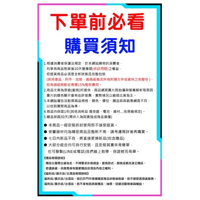 - 商品到貨享十天猶豫期之權益(注意!猶豫期非試用期),依法辦理退貨商品必須是全新狀態且包裝完整(包含主機、附件、內外包裝、隨機文件、贈品等)。如商品一經拆封或使用致商品價值受損(例僅得以福利品出售),商店將向消費者就商品一部或全部價值減損收取適當之費用(回復原狀、整新費),否則將影響退貨的權限。請先確認商品正確、外觀可接受,再行開機/使用,以免影響您的權利,祝您購物順心。