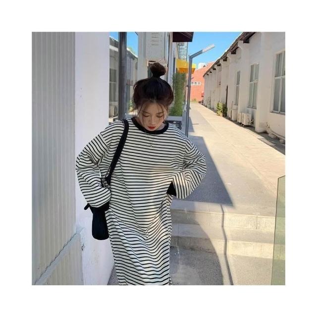 CHIEMI一件式懶人穿搭☘︎秋冬薄絨極簡風寬鬆條紋長版長袖連身裙|內刷毛洋裝 連衣裙 長裙 T恤裙 長T 女裝