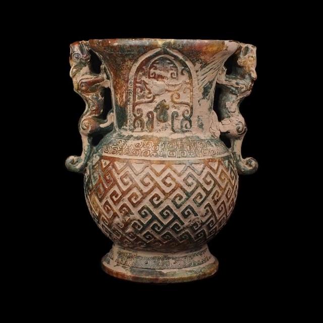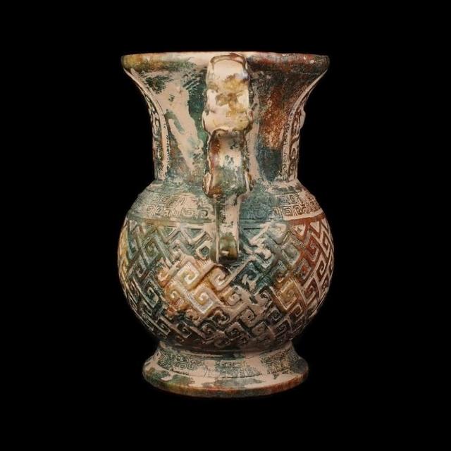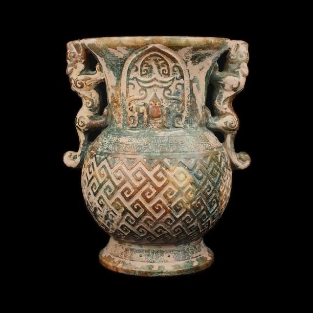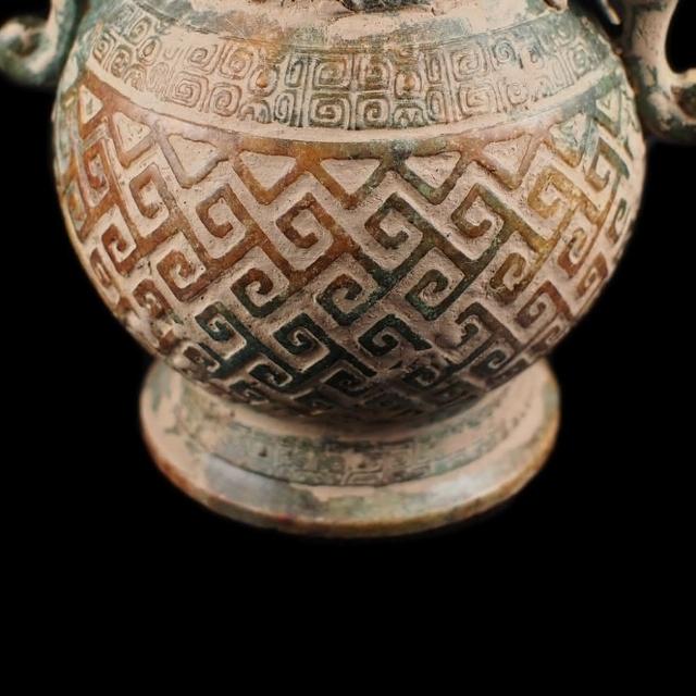 《博古珍藏》漢 天然青黃玉雕回紋雙獸耳玉瓶擺件 1.58公斤 老件文物 早期收藏 青銅硃砂沁