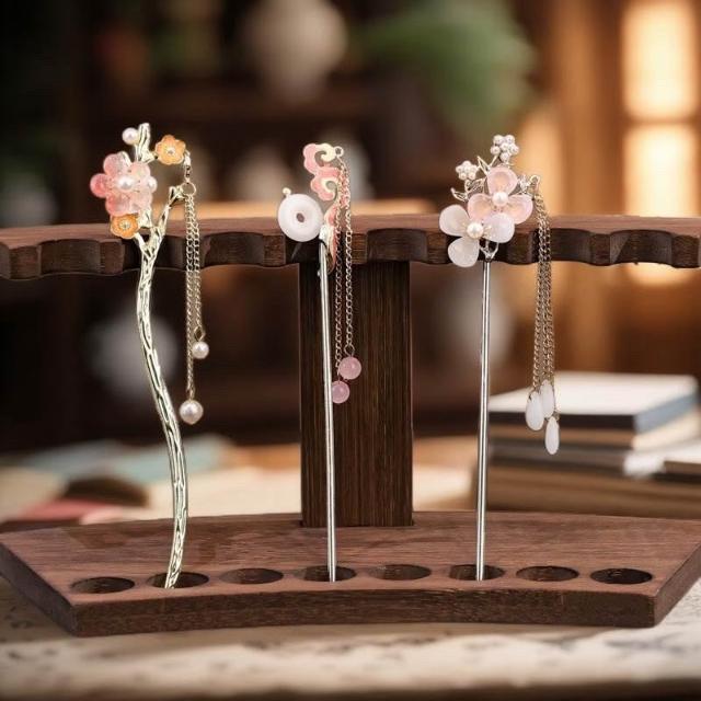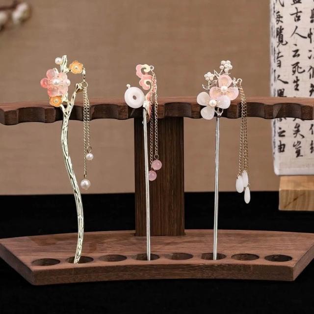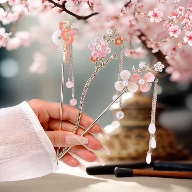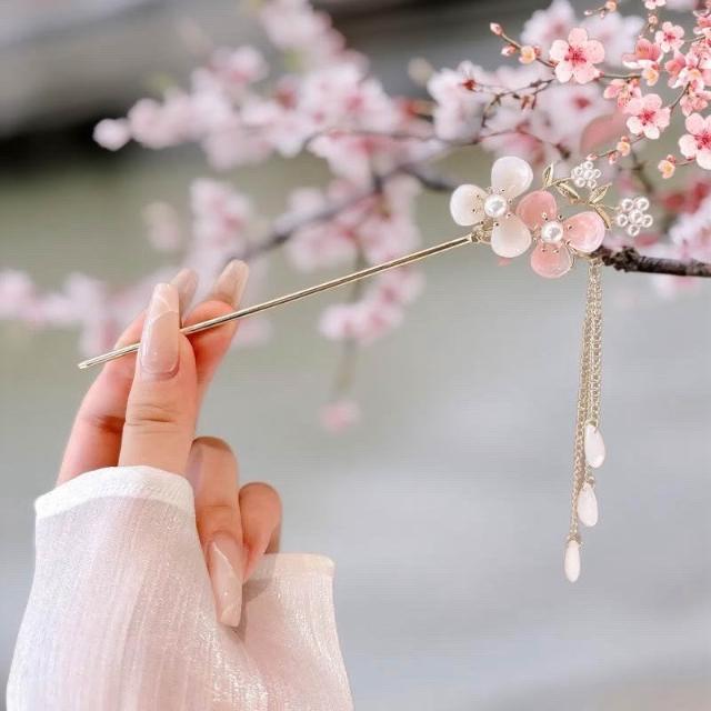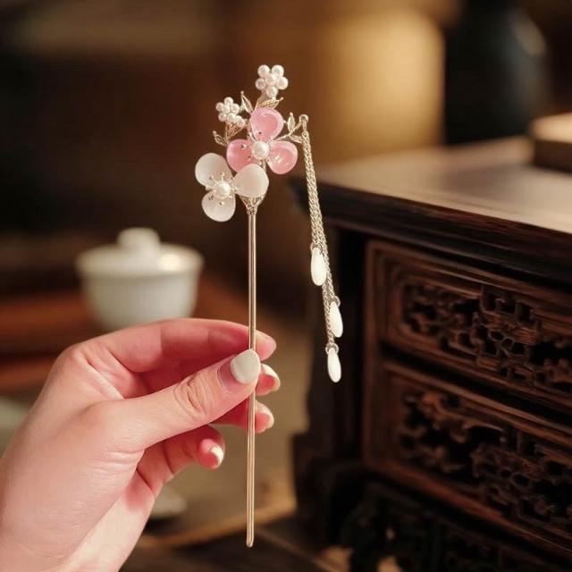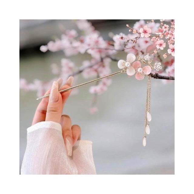 {遇見臻品}C106桃花流蘇髮簪閃亮少女心粉紅髮簪女童國風馬面裙漢服簪子髮釵盤髮頭飾古風梨流蘇髮簪新中式古風古裝玉簪釵