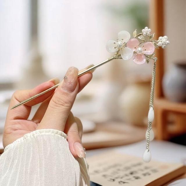 {遇見臻品}C106桃花流蘇髮簪閃亮少女心粉紅髮簪女童國風馬面裙漢服簪子髮釵盤髮頭飾古風梨流蘇髮簪新中式古風古裝玉簪釵