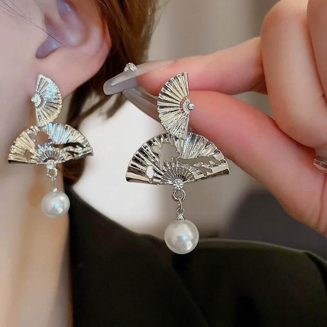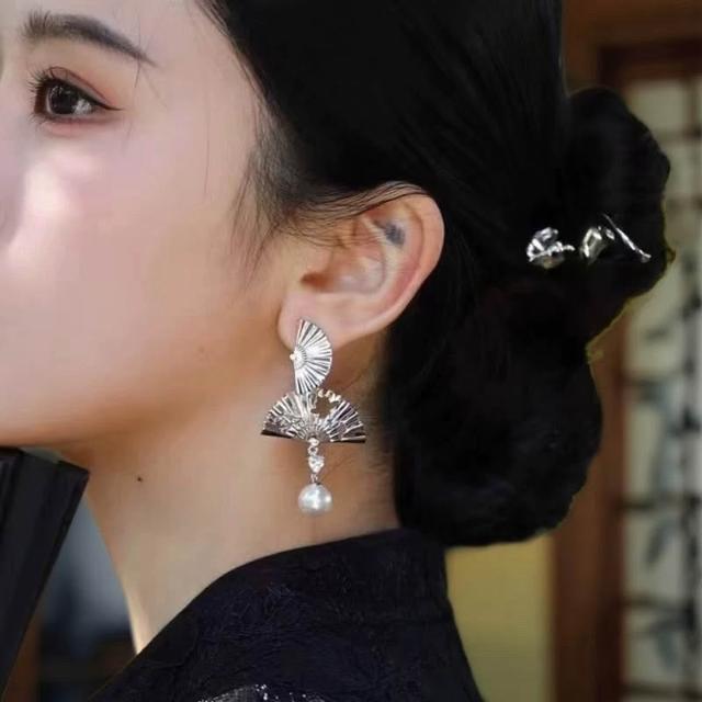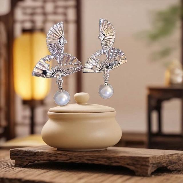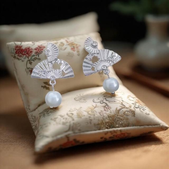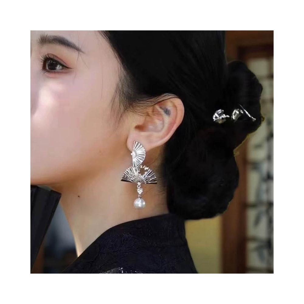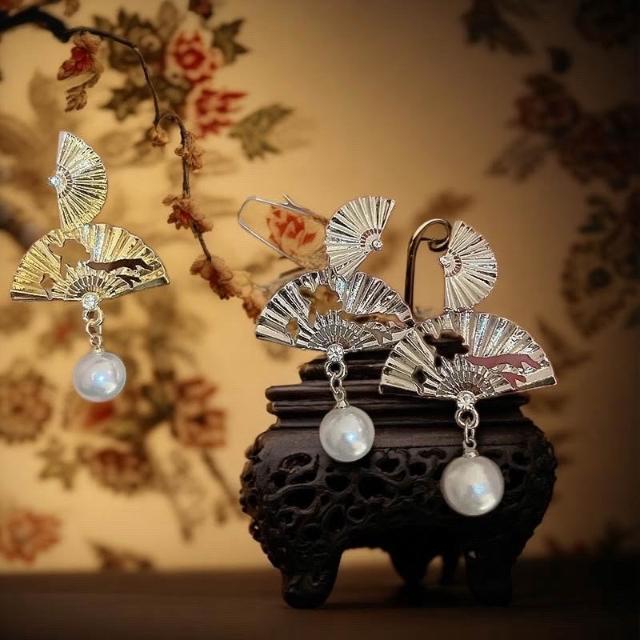 {遇見臻品}BG395夾式及耳針國風漢服旗袍扇形耳環墜中式珍珠耳環新中式扇形珍珠耳環國風古風耳飾氣復古風耳環造型耳環