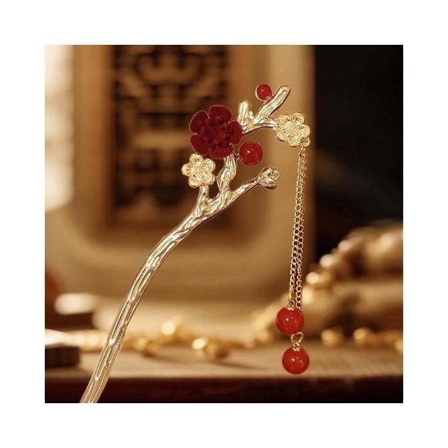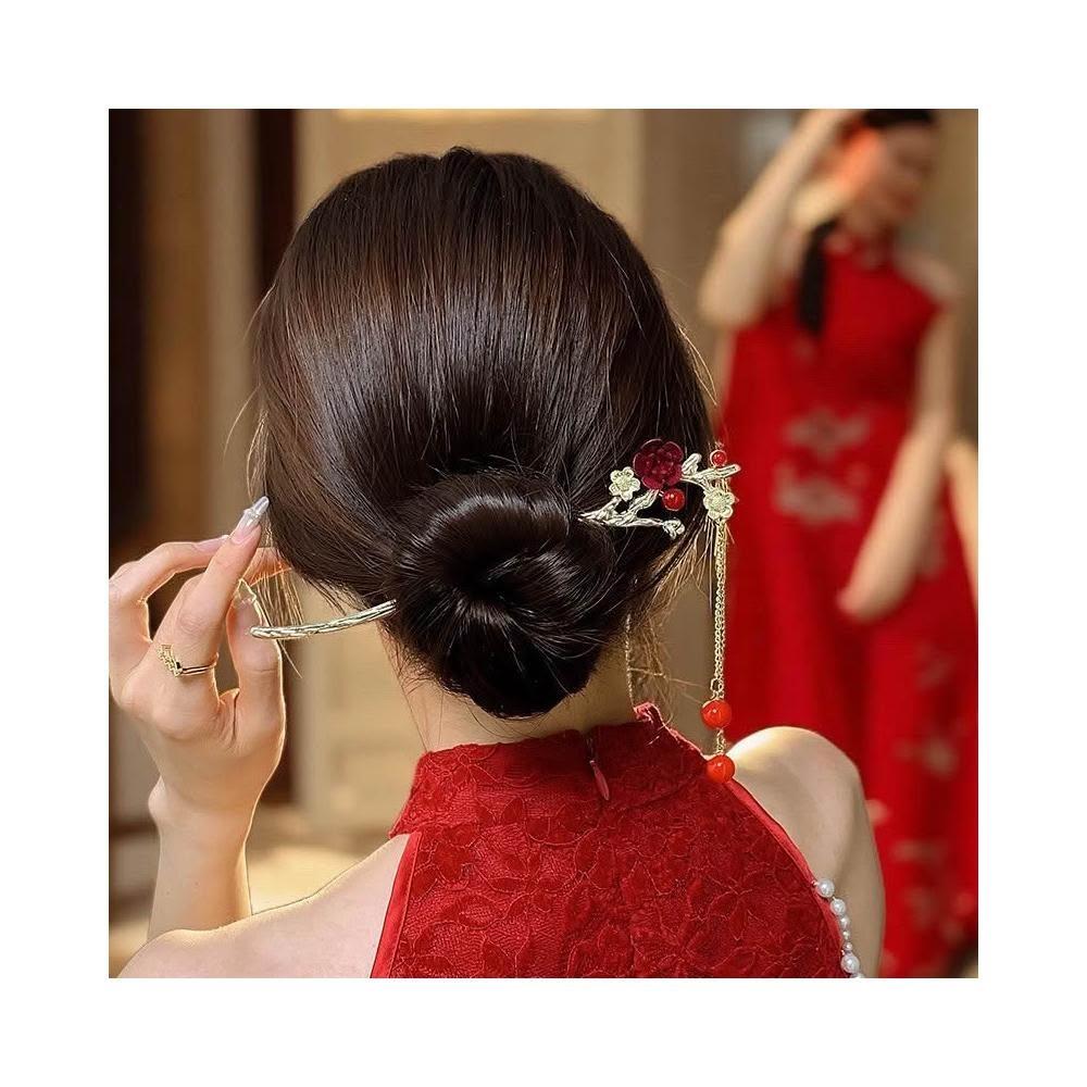 {遇見臻品}C115絨植紅色玫瑰流蘇髮簪紅色髮簪新娘頭飾新中式紅色玫瑰U型流蘇發簪女童漢服頭飾步搖髮叉 馬面裙簪子U髮插