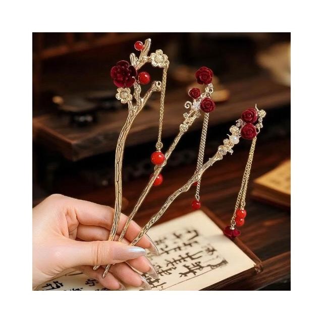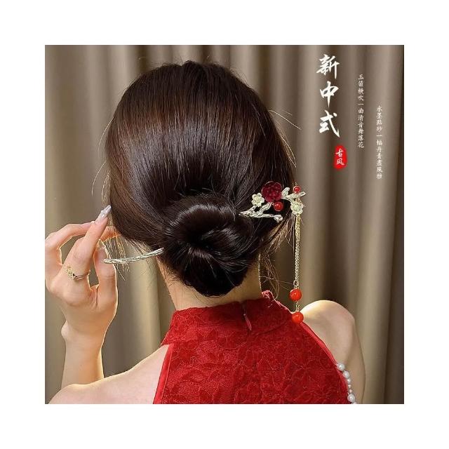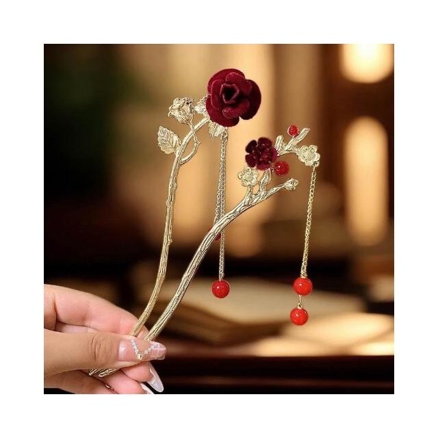 {遇見臻品}C115絨植紅色玫瑰流蘇髮簪紅色髮簪新娘頭飾新中式紅色玫瑰U型流蘇發簪女童漢服頭飾步搖髮叉 馬面裙簪子U髮插
