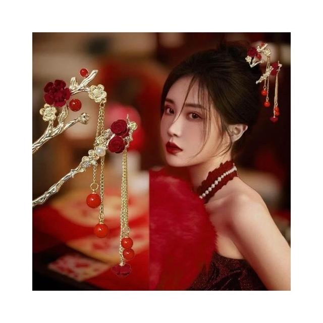 {遇見臻品}C115絨植紅色玫瑰流蘇髮簪紅色髮簪新娘頭飾新中式紅色玫瑰U型流蘇發簪女童漢服頭飾步搖髮叉 馬面裙簪子U髮插