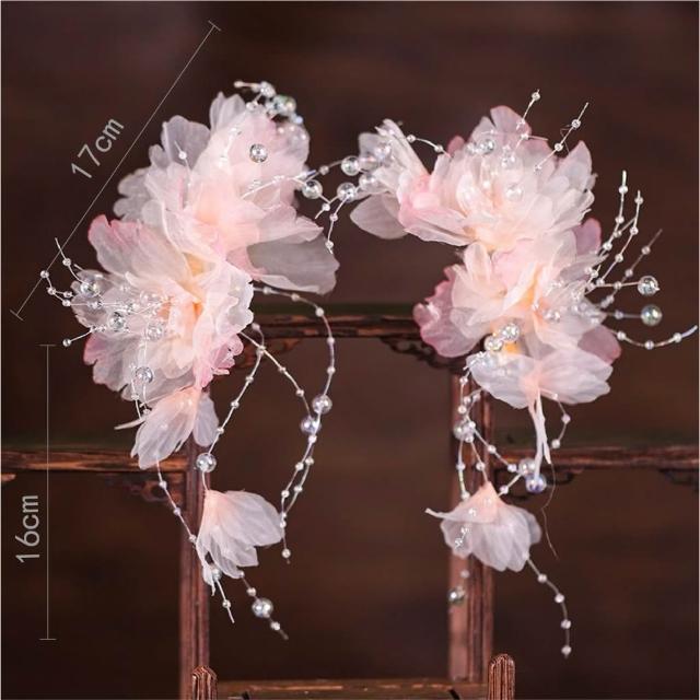 遇見臻品粉櫻幻彩絹花髮飾 珍珠流蘇新娘頭飾 婚禮造型側邊配飾 仙氣髮夾(現貨/日系甜美/唯美浪漫/森系攝影)C182