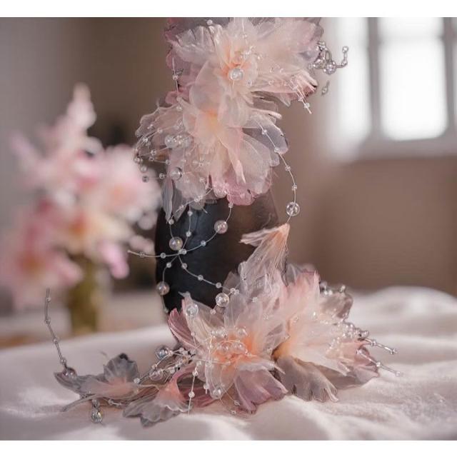 遇見臻品粉櫻幻彩絹花髮飾 珍珠流蘇新娘頭飾 婚禮造型側邊配飾 仙氣髮夾(現貨/日系甜美/唯美浪漫/森系攝影)C182