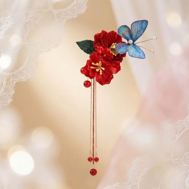 遇見臻品FA207 古風紅花蝴蝶流蘇髮簪 (漢服配飾/新娘頭飾/步搖)