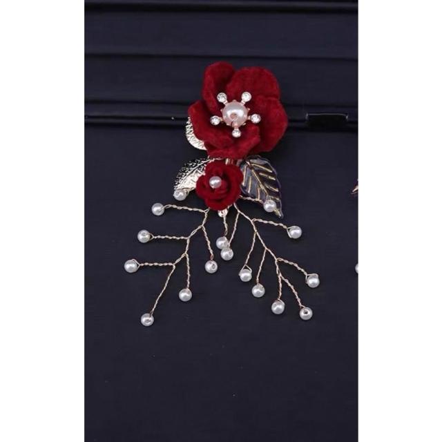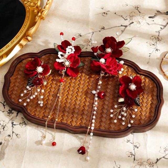 遇見臻品古典酒紅絹花髮飾套組 珍珠流蘇步搖髮釵 新娘婚禮頭飾 (現貨/中式古風/旗袍造型/敬酒服配飾) FA209