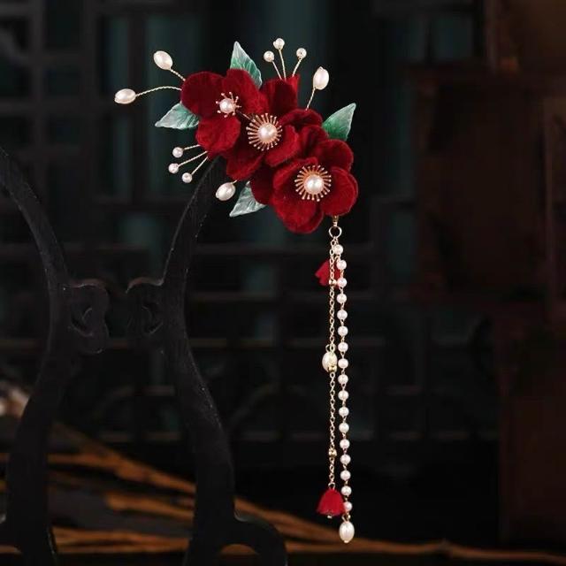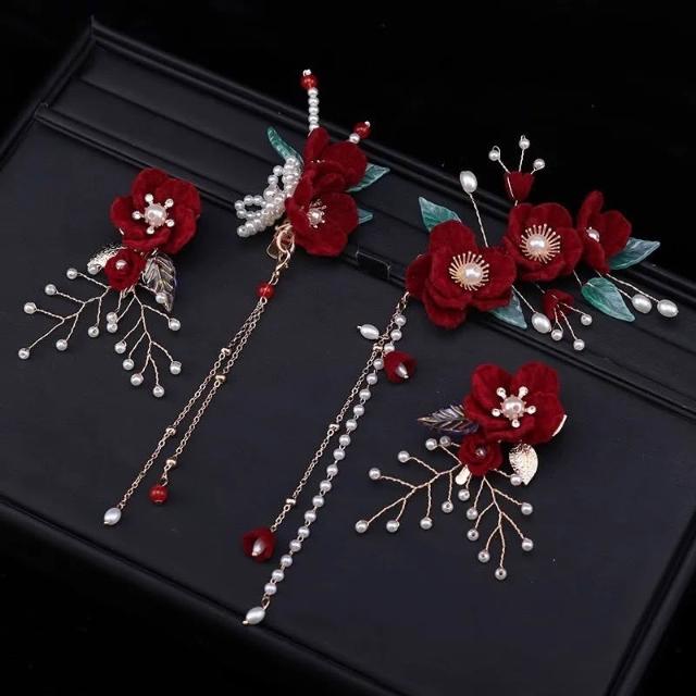 遇見臻品古典酒紅絹花髮飾套組 珍珠流蘇步搖髮釵 新娘婚禮頭飾 (現貨/中式古風/旗袍造型/敬酒服配飾) FA209
