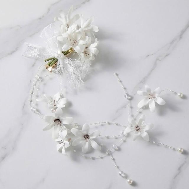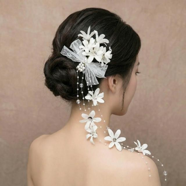 遇見臻品白皙百合蕾絲蝴蝶結髮飾 珍珠花卉長流蘇頭飾 新娘背影造型 婚禮白紗配飾 (現貨/森林系/女神範) FA214