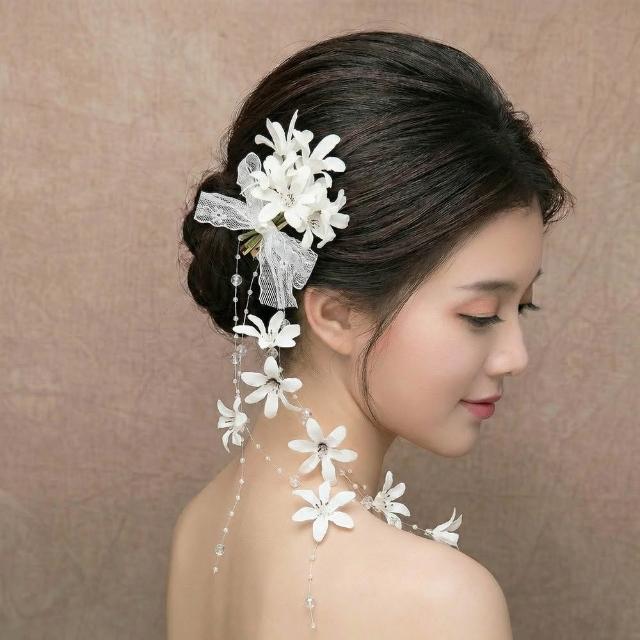 遇見臻品白皙百合蕾絲蝴蝶結髮飾 珍珠花卉長流蘇頭飾 新娘背影造型 婚禮白紗配飾 (現貨/森林系/女神範) FA214