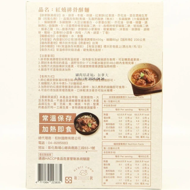 和秋和秋 紅燒排骨酥麵 530g 加熱即食 常溫保存 即食料理包 排骨酥 排骨酥麵 紅燒 團購美食