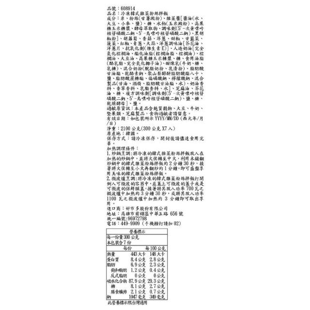5Cgo🏆Hau 冷凍韓式雜菜粉絲拌飯300公克X7包/袋#608914—303
