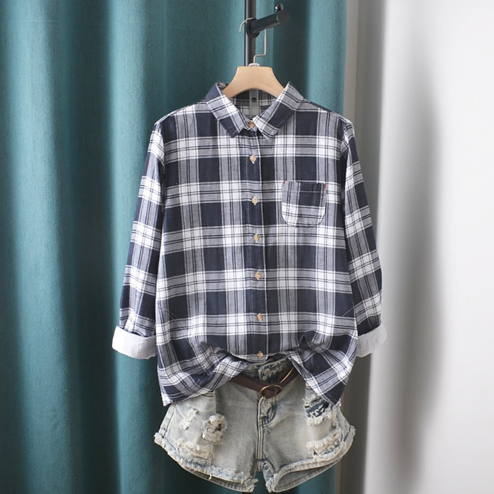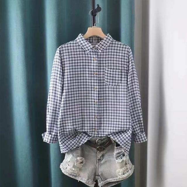 設計所在棉麻隨性風 格子襯衫長袖休閒寬鬆上衣(2色可選)