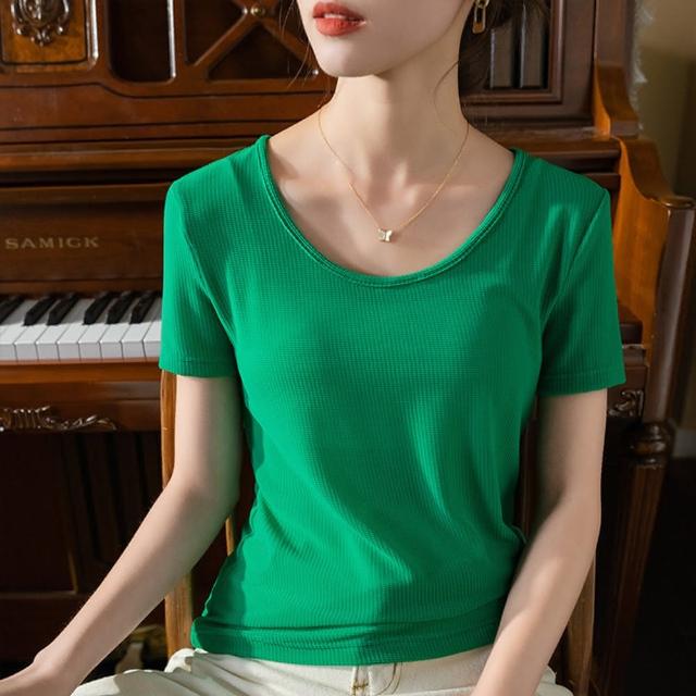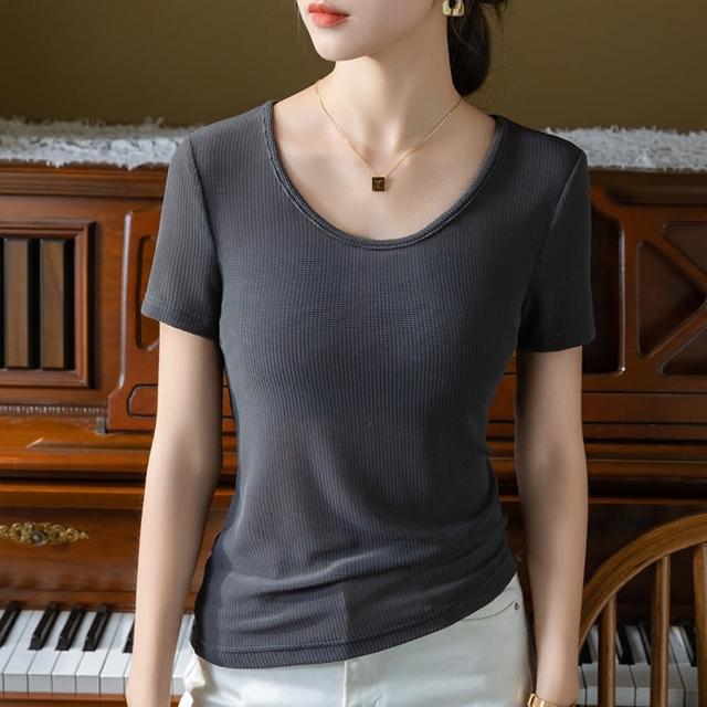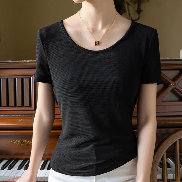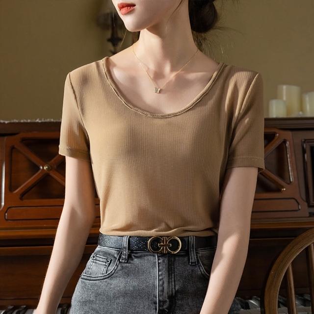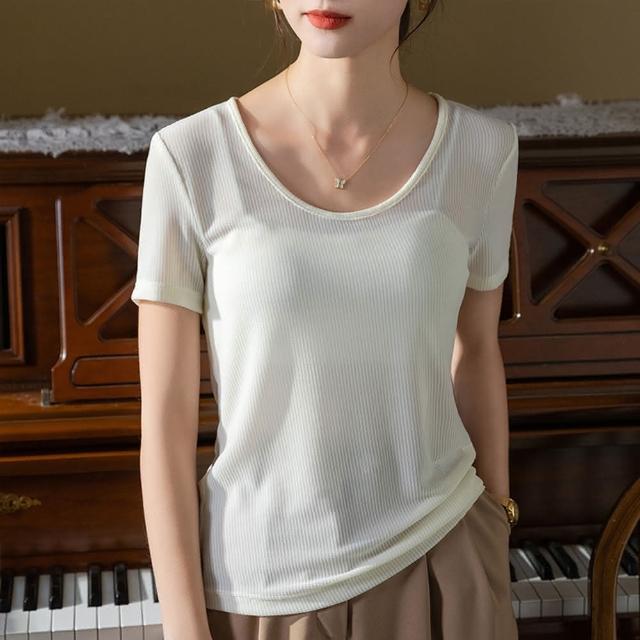設計所在專注內搭系列 冰絲短袖T恤大圓領網紗彈力涼感收腰上衣 T3X0409(7色 S-3XL可選)