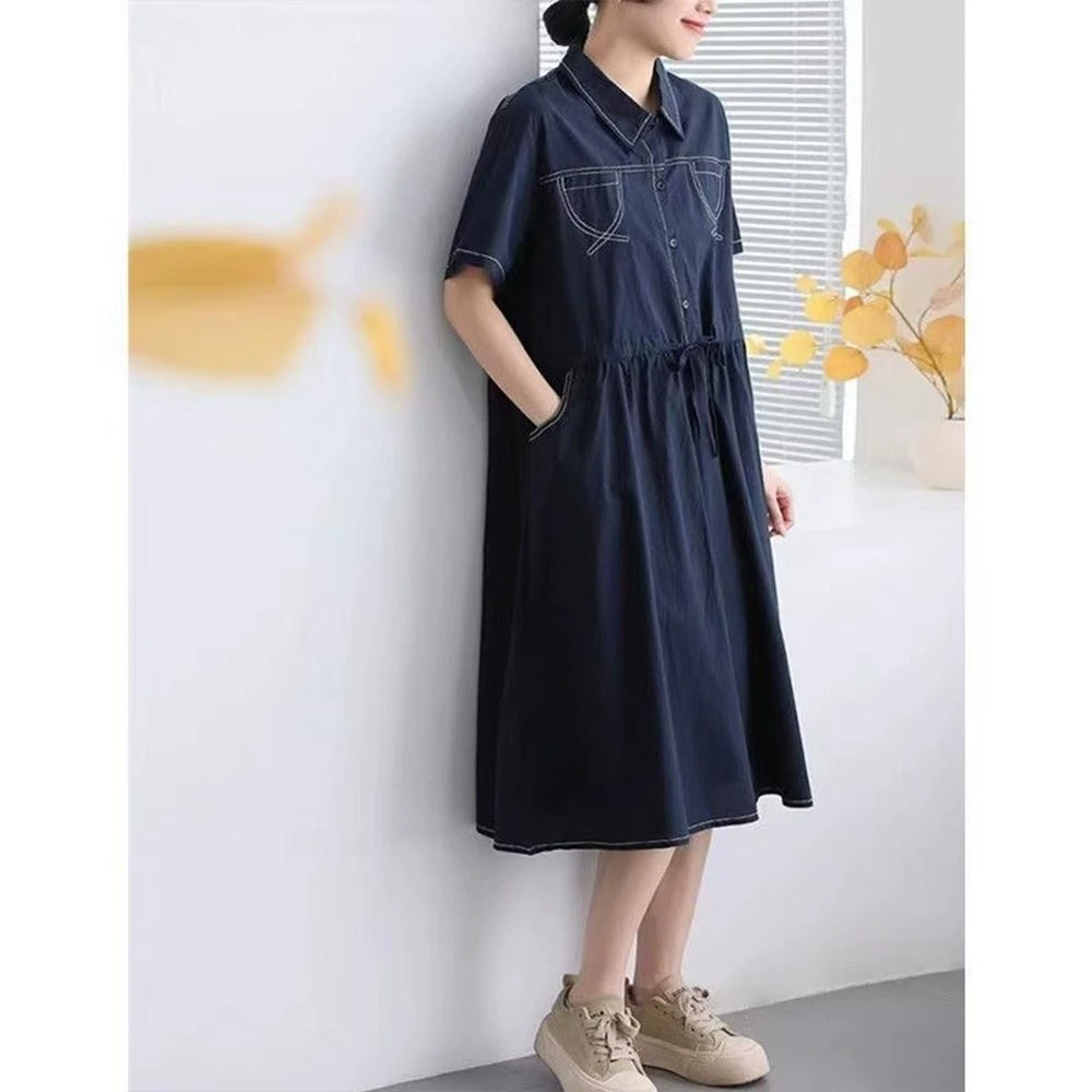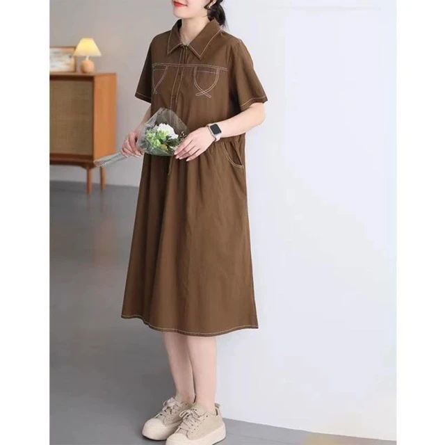 設計所在棉麻隨性風 棉短袖洋裝休閒寬鬆中長裙(2色可選) 9631