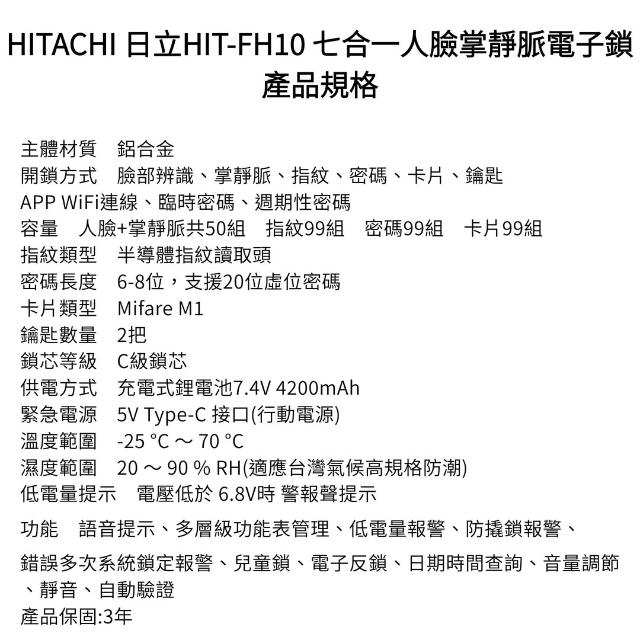 HITACHI 日立HITACHI 日立 七合一人臉貓眼 掌靜脈電子鎖HIT-FH10-T