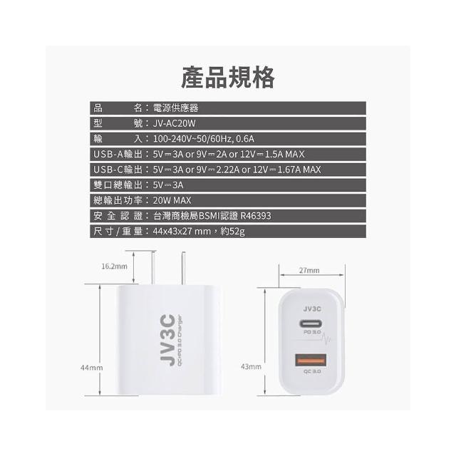 JV3C20W 30W PD QC 雙孔快速充電器 閃電充電器 充電頭 充電器 BSMI認證 快充頭 快充 插頭