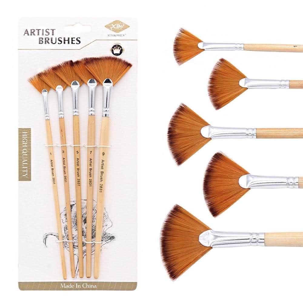 雙色扇形畫筆5入組 (畫筆 刷具 水彩筆 尼龍毛 原木桿 魚尾扇形 手繪筆 水粉筆 油畫筆 彩繪筆 開學季)